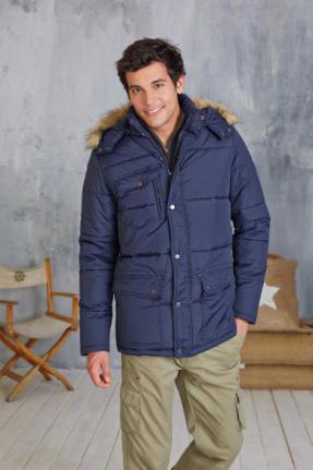100% polyester. Enduction PVC. Matelassage 100% polyester. Fermeture zippée avec patte de boutonnage à pression. 2 poches avant plaquées avec rabat et boutons pression et 1 poche poitrine zippée avec rabat fantaisie. 1 poche intérieure zippée. Capuche zippée amovible ouatinée avec boutons pression et pourtour en fourrure synthétique (fourrure claire pour le coloris Navy et foncée pour le coloris Black). Finition bas de manche en bord-côte 2x2 pour protéger du froid. 2 zip pour personnalisation : intérieur bas de vêtement et poitrine.