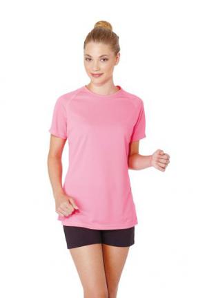 100% polyester. Tissu léger à séchage rapide. Encolure ronde avec bande de propreté. Manches raglan avec points de recouvrement. Finition double aiguille à l\'encolure, bas de manches et de vêtement.